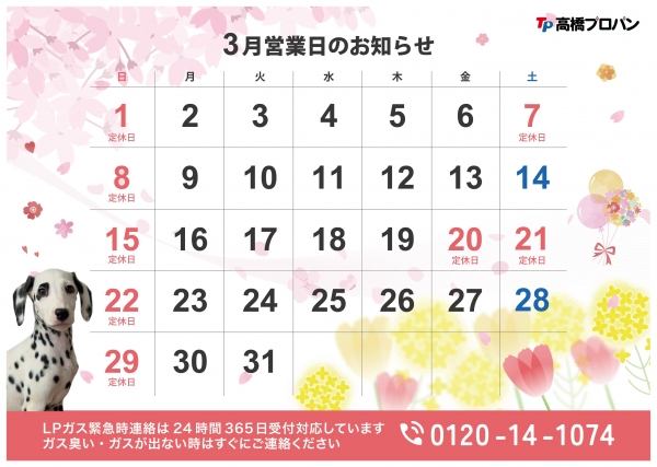 3月の営業日をお知らせいたします。