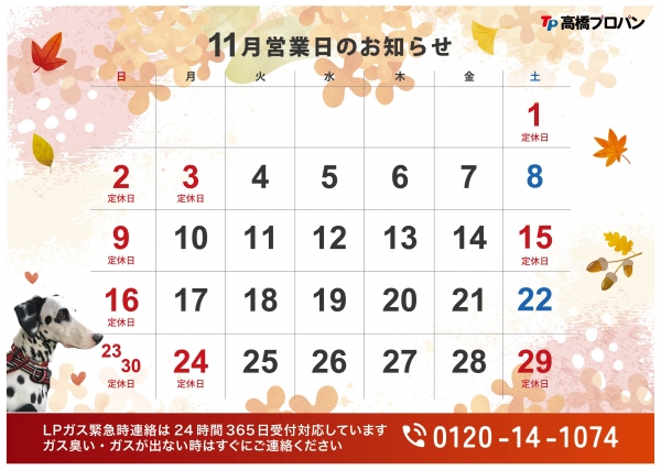 2025/10/24 11月営業日のお知らせ いつも高橋プロパンをご利用いただき、誠にありがとうございます。 11月の営業日をお知らせいたします。 窓口業務は、第1・3・5土曜日、日曜・祝日がお休みです。 LPガス・電力の緊急連絡は、24時間365日受付対応しています。 「ガス臭い」「ガスが出ない」「停電した」場合は、すぐにご連絡ください。 フリーコール:0120-14-1074 ※繋がりにくい場合は0463-31-1074へご連絡ください ガス臭い時は火気厳禁です。換気扇は回...